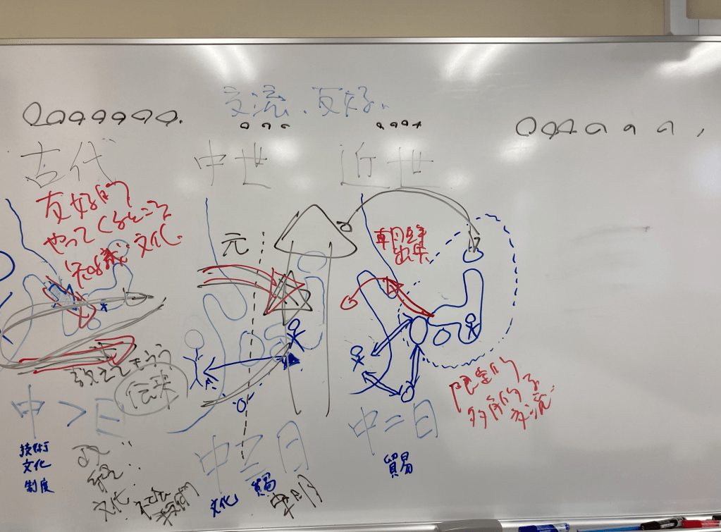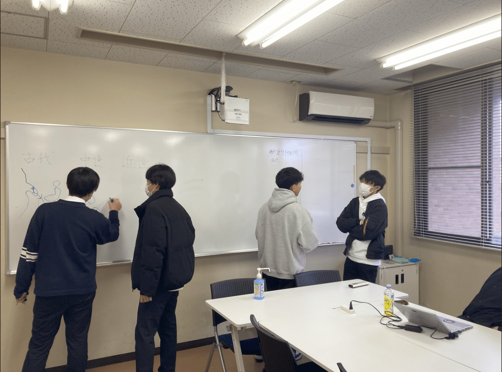 また,陳さんの調査を踏まえて,B3の学生たちが「日本の教科書における日中関係の変化に関する記述をまとめた図」と「調査結果をまとめていくエクセルシート案」についての提案を行いました(写真1~3)。ゼミ生全員で議論をしながら,陳さんの今後の研究の手助けとなるものができたと感じています。