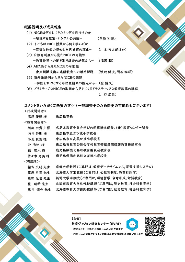 内閣府が実施し,科学技術振興機構(JST)が管理する「戦略的イノベーション創造プログラム(SIP)」の第3期課題「ポストコロナ時代の学び方・働き方を実現するプラットフォームの構築」に,広島大学大学院人間社会科学研究科・教育ヴィジョン研究センター(EVRI)が提案・採択された事業「デジタル・シティズンシップ・シティ:公共的対話のための学校(NICE)」が採択されています(研究開発責任者:草原和博)。このたび,NICEのキックオフシンポジウムが開催されます(2023年2月23日14時00分-17時00分)。草原や一部ゼミ生がNICEの成果方向のために登壇しますので,どうぞご参加ください。
