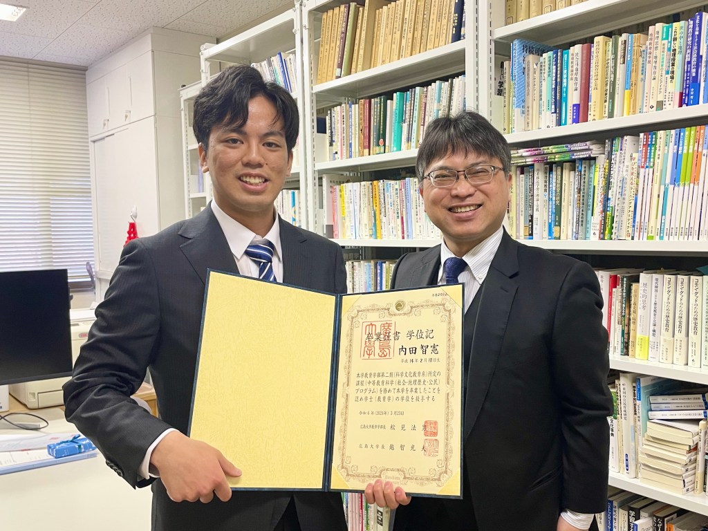 2024年3月23日に,令和5年度広島大学学位記授与式が挙行されました。これにより,草原和博研究室では,両角遼平(教育学研究科博士課程後期)・正出七瀬(人間社会科学研究科博士課程前期)が大学院を修了,内田智憲(教育学部)が大学を卒業しました。以下は,修了・卒業した3名からのご挨拶です。