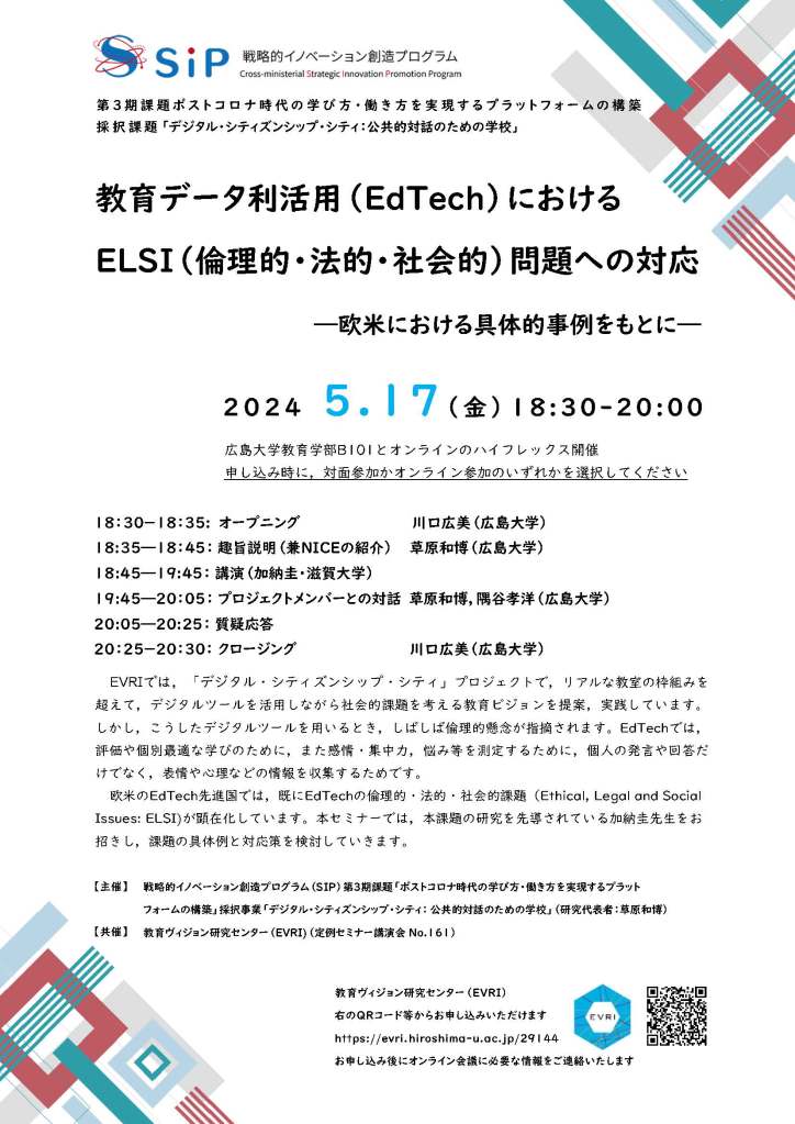 2024年5月17日(金)18:30~20:00に,教育ヴィジョン研究センター(EVRI)の定例セミナー講演会No.161「教育データ利活用(EdTech)におけるELSI(倫理的・法的・社会的)問題への対応-欧米における具体的事例をもとに-」が開催されます。本セミナーは,草原が研究開発責任者を務める「デジタル・シティズンシップ・シティ:公共的対話のための学校(NICE)」事業の一環で行われるものです。草原も登壇予定です。広島大学教育学部B101とオンラインのハイフレックスで開催されます。どうぞ奮ってご参加ください。