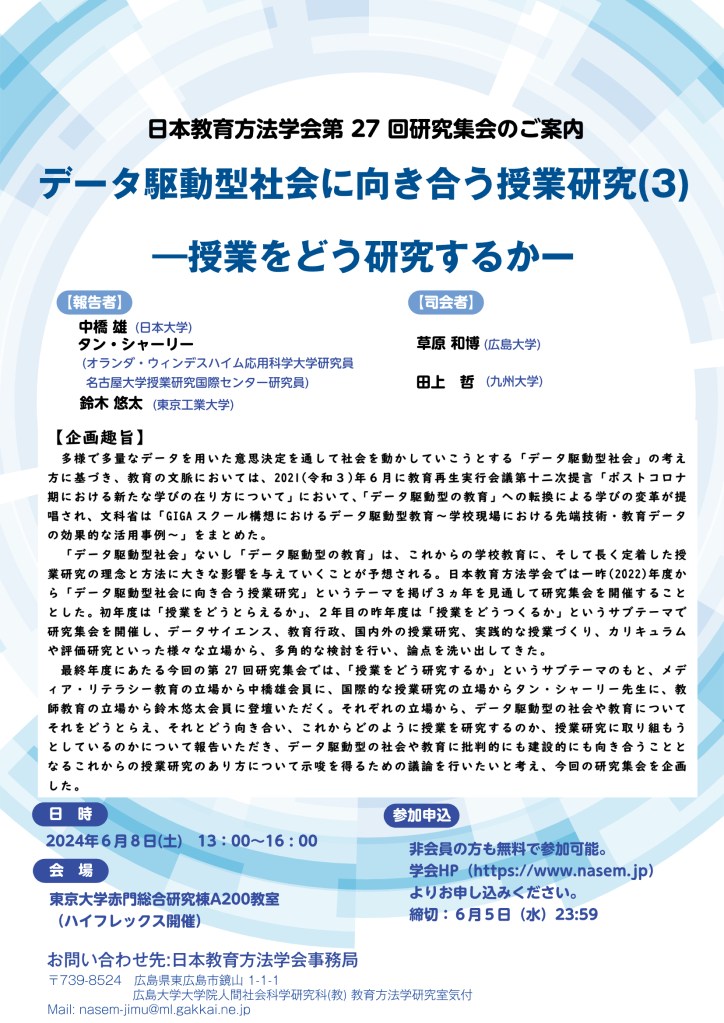2024年6月8日(土)13:00~16:00に日本教育方法学会第27回研究集会「データ駆動型社会に向き合う授業研究(3)―授業をどう研究するか―」が開催されます。草原は司会を担当します。対面(於 東京大学 赤門研究棟A200教室)とオンラインのハイフレックス開催予定です。会員資格に関わらず,どなたでもご参加いただけます。どうぞ奮ってご参加ください。