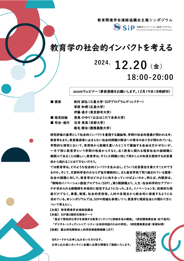 2024年12月20日(金)18:00~20:00に教育関連学会連絡協議会主催シンポジウム「教育学の社会的インパクトを考える」が開催されます。「デジタル・シティズンシップ・シティ:公共的対話のための学校(NICE)」(研究開発責任者:草原和博)が共催するシンポジウムです。草原も提案者として登壇し,NICEのミッションと思い描くヴィジョン、これまでのプロジェクトの取組状況の成果と課題を報告します。オンラインで開催予定です。どうぞ奮ってご参加ください。