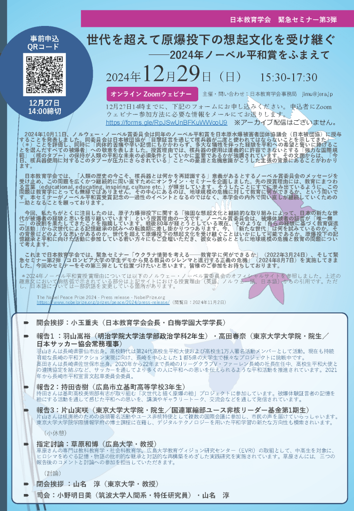 草原が日本教育学会緊急セミナーに登壇します(2024.12.17) 投稿者:kusazemi2024年12月17日2024年12月17日カテゴリー:お知らせ 2024年12月29日(日)15:30~17:30に日本教育学会緊急セミナー第3弾「世代を超えて原爆投下の想起文化を受け継ぐ──2024年ノーベル平和賞をふまえて」が開催されます。草原は指定等論者として登壇します。オンラインで開催予定です。どうぞ奮ってご参加ください。 ▶会の詳細・参加申込はこちらをクリック